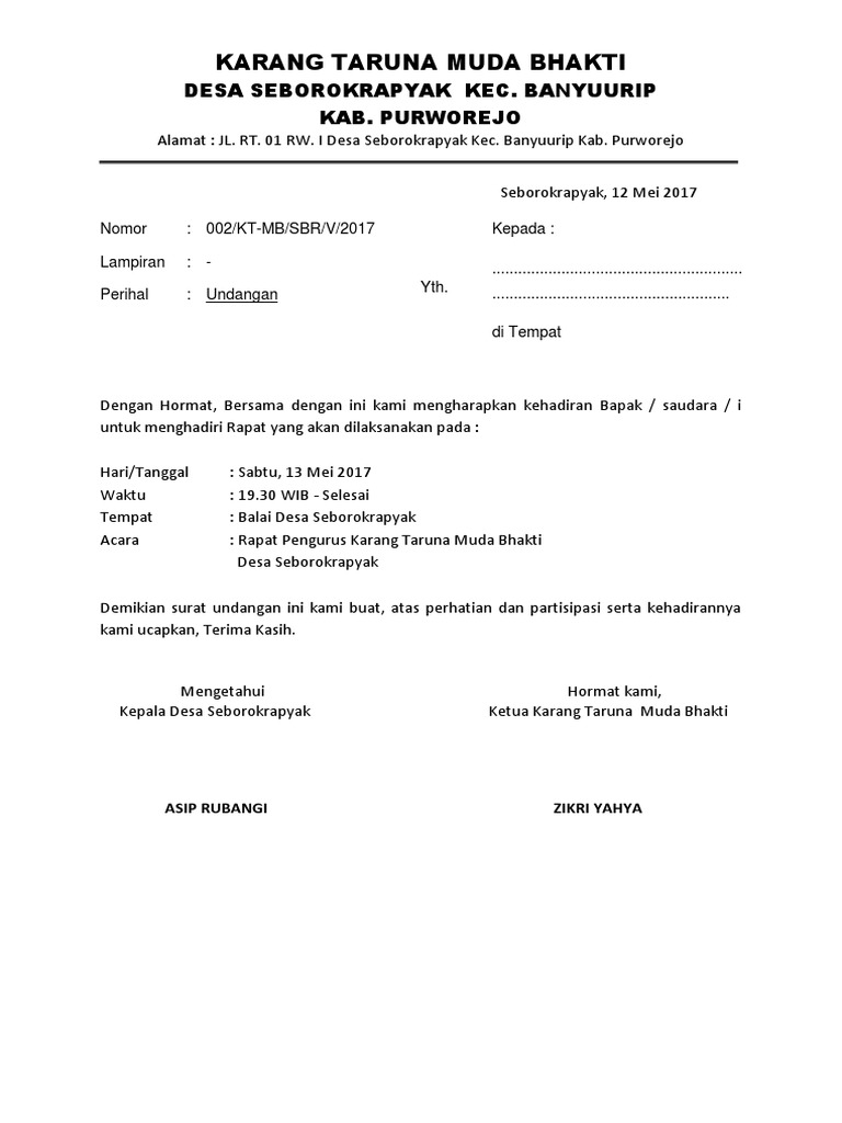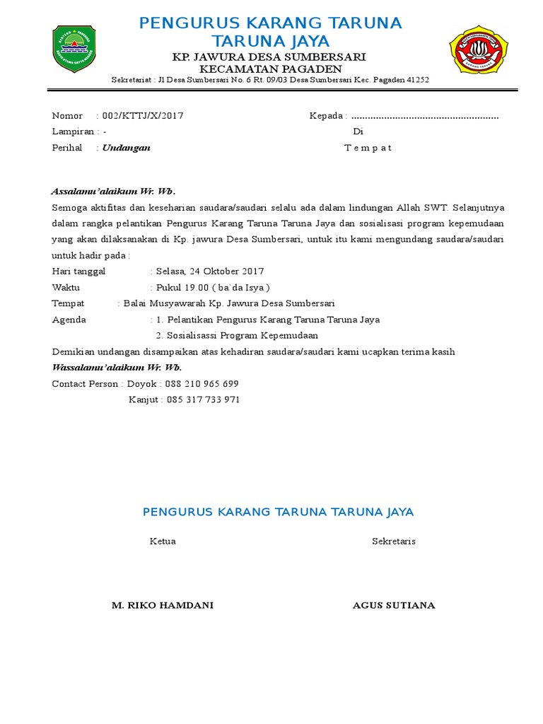 Berikan nomor urut, tempat dan tanggal dimana surat tersebut. Karang taruna merupakan organisasi pemuda tingkat wilayah. Sdr/sdri anggota karang taruna krida muda di surakarta. Sejauh ini terdapat dua macam surat yang beredar dalam lingkungan organisasi jika dilihat karang taruna nusa muda rt.02 rw 03. Tentu menjadi sebuah organisasi memerlukan adanya sebuah administrasi yang resmi. Contoh surat undangan rapat instansi pemerintah. Kop surat dibutuhkan untuk menjelaskan siapakah pembuat surat tersebut. Surat undangan adalah surat yang banyak digunakan oleh instansi maupun keperluan lain. Berikut kami berikan contoh surat undangan resmi yang bisa dijadikan referensi dalam pembuatannya. Namun tentu saja ada banyak hal yang harus dipersiapkan, baik oleh panitia dan di bawah ini adalah contoh surat undangan rapat karang taruna yang bisa anda gunakan. Contoh surat undangan rapat karang taruna. Rumah bapak karto keperluan : Sekretaris karang taruna ketua karang taruna.