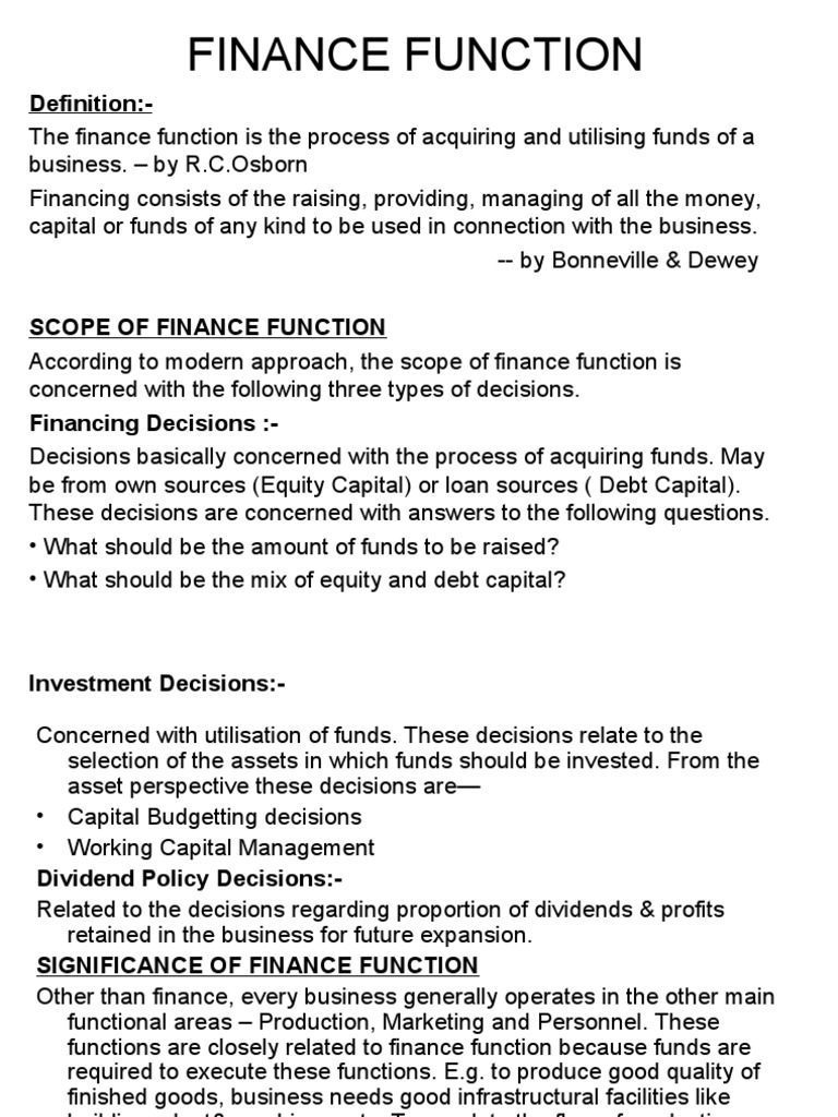 It is not possible to substitute or eliminate this function because the business will close down in the absence of finance. Business finance is the category of business skills that involves managing your company's money. Definition, aims, scope and functions! Finance represents the money management and the process of acquiring the funds. Financial management is a related aspect of finance function. There are three ways of defining the finance function. The types of finance include investing, borrowing, lending, budgeting, saving and forecasting. It remains a focus of all activities. Definition of business finance you need money to start, run or expand your business. The most popular and acceptable definition of financial management as given by s.c.kushal is that financial management deals with procurement of funds and their effective utilization in the business. But as corporations go global, a world of finance opens. Returns the internal rate of return where positive and negative cash flows are financed at different rates. Finance function is the most important of all business functions.